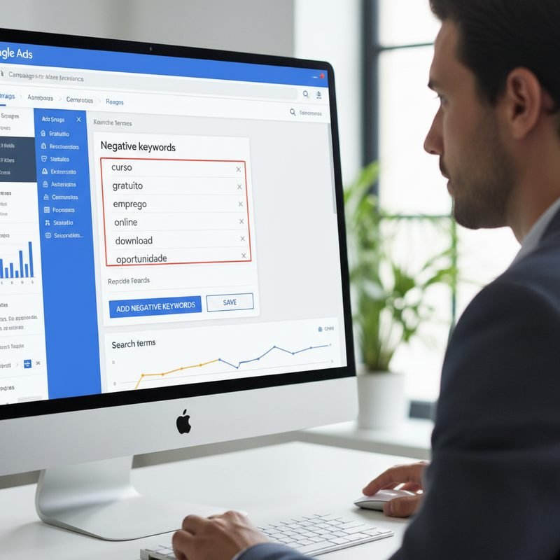 Exemplo prático: um escritório que negativou termos como “curso” e “apostila” reduziu o CPC médio em 20% e aumentou a taxa de conversão em 25% em três meses.